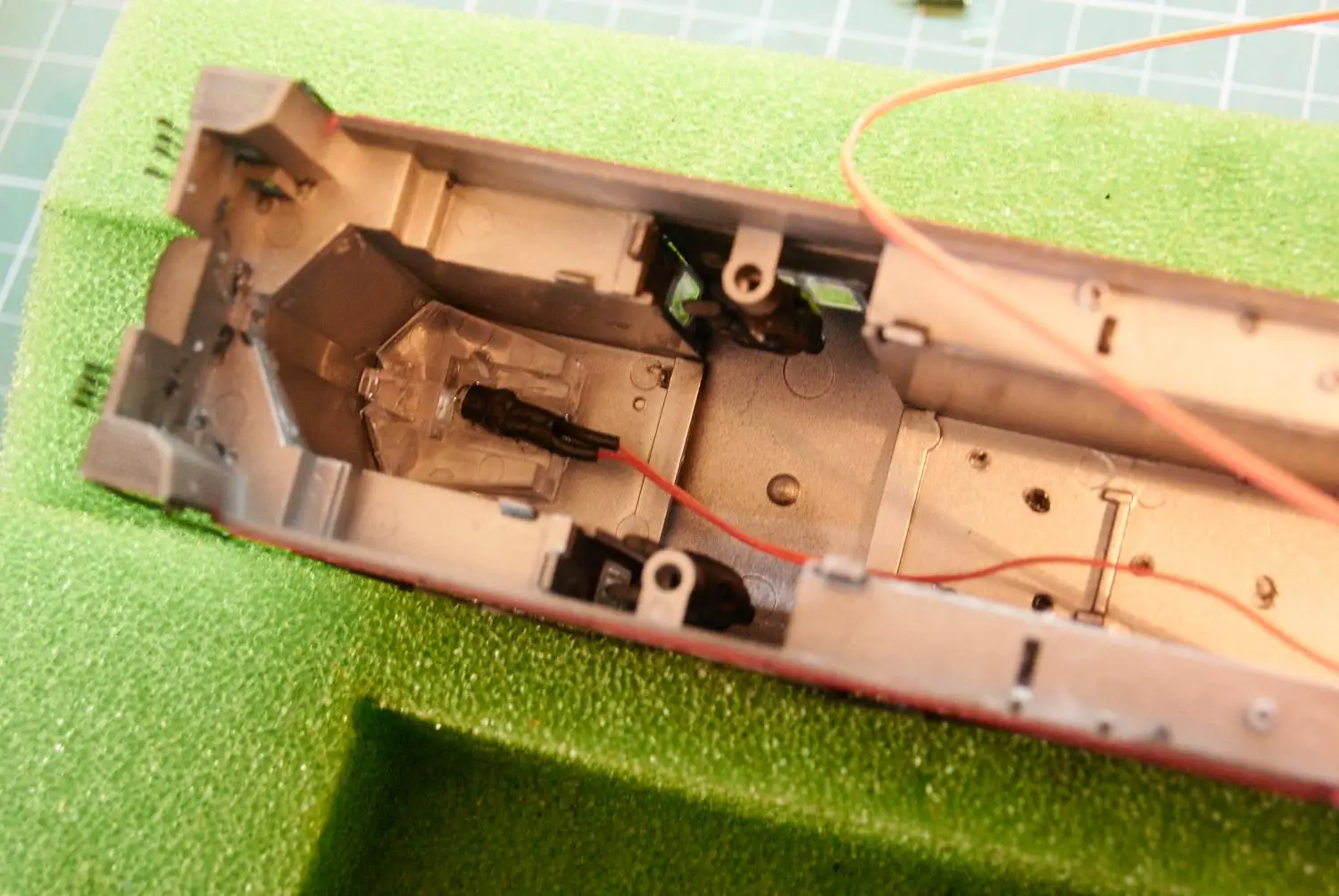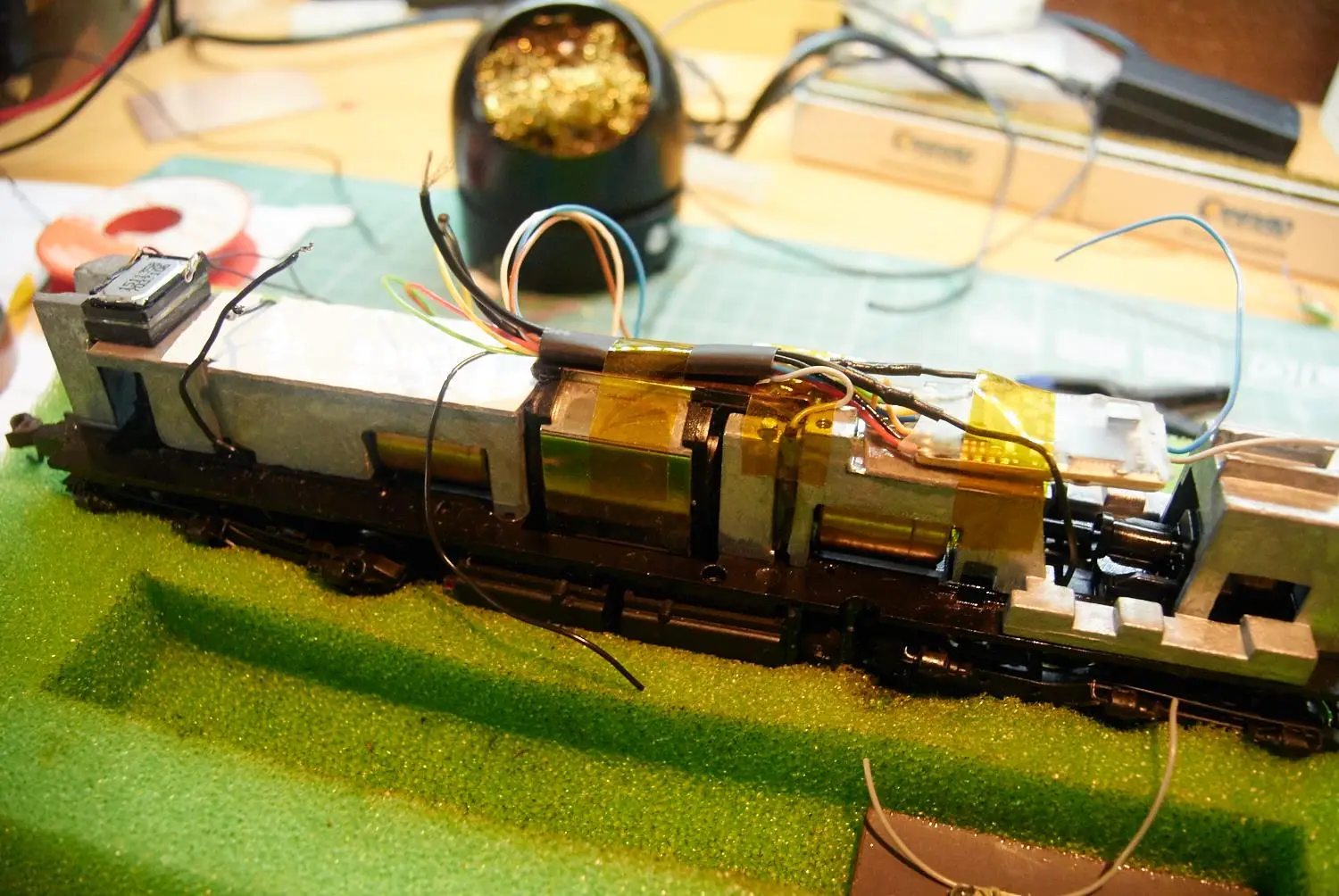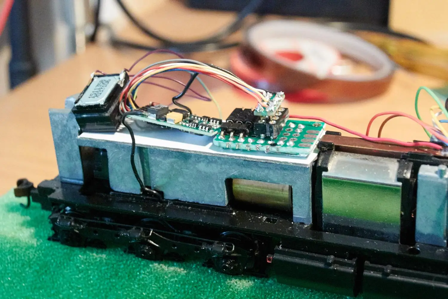 Vgradnja zvočnika in ploščice z predupori za luči in konektorjem za Tsunami. Motorni dekoder je priključen direktno. Za konektor pri Zvočnem dekoderju sem se odločil zaradi lažjega programiranja.