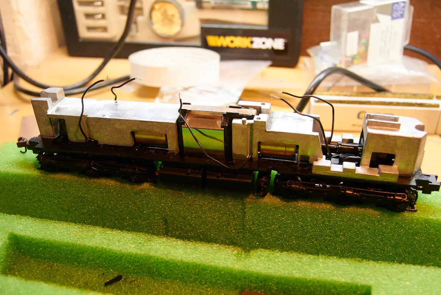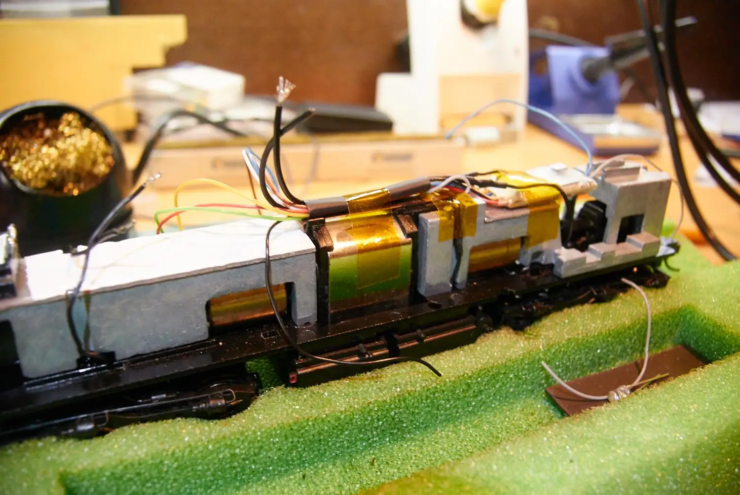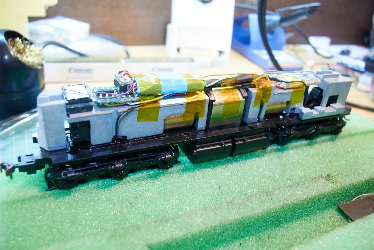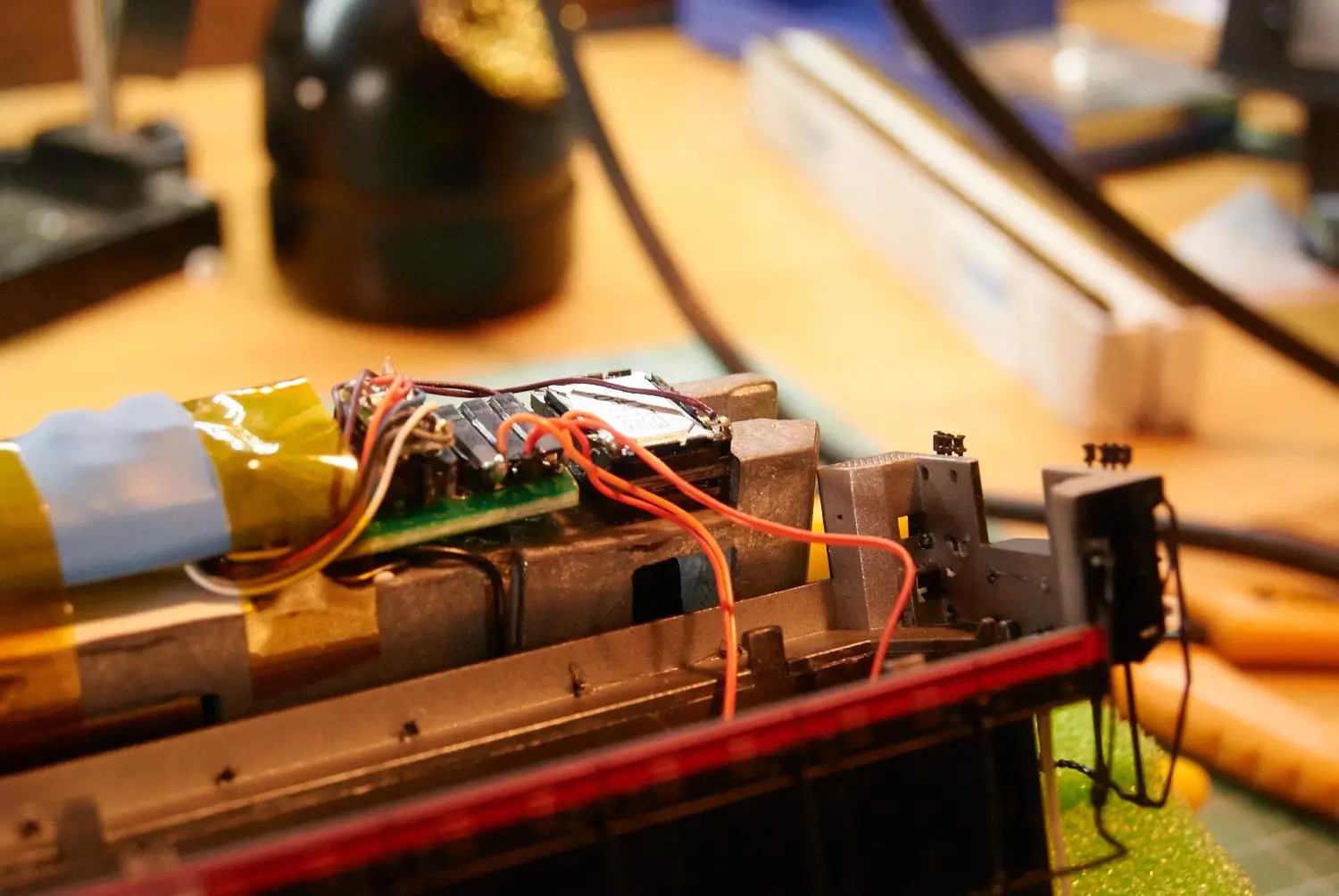 Vgradnja zvočnika in ploščice z predupori za luči in konektorjem za Tsunami. Motorni dekoder je priključen direktno. Za konektor pri Zvočnem dekoderju sem se odločil zaradi lažjega programiranja.