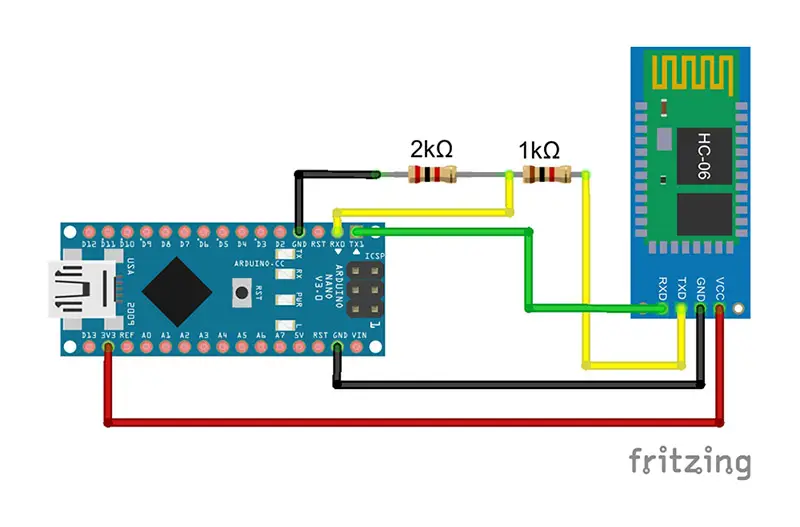 Pri samem Bluetooth modulu je potrebno narediti uporovni delilnik, v razmerju 2:1 zato ker ima HC-06 na vhodu TX dovoljeno max 3.3V. Napajanje ni kritično lahko je od 3.6 do 6V.