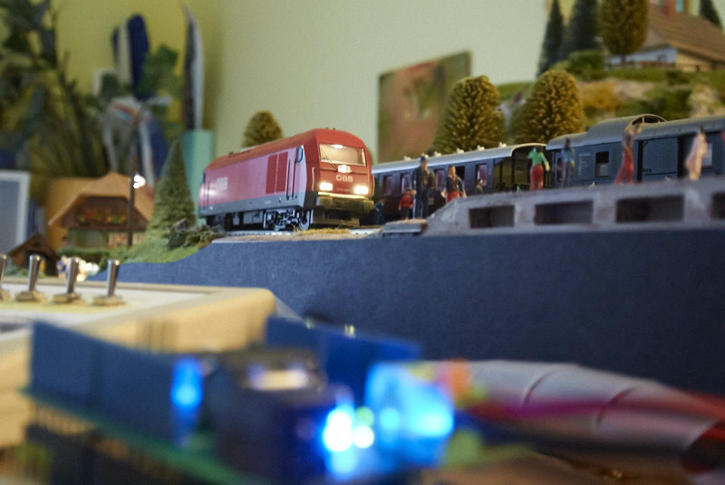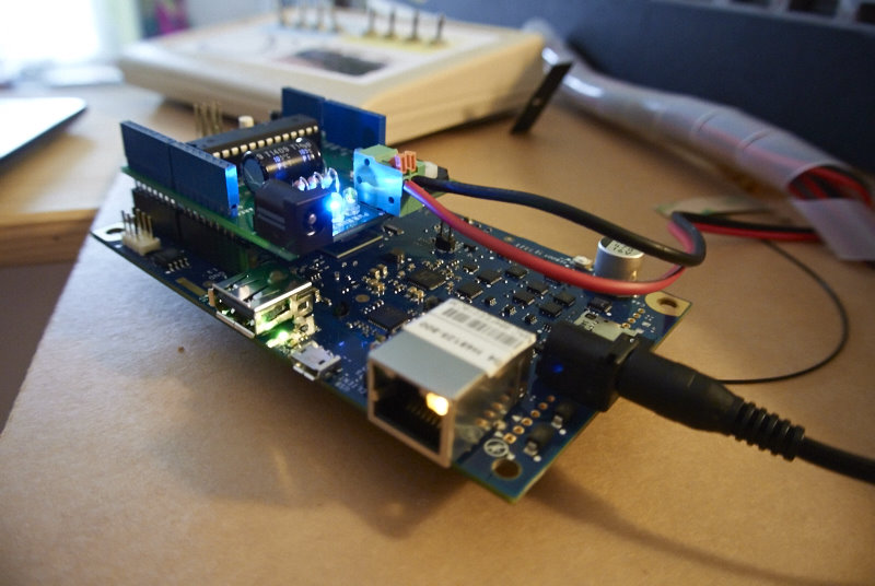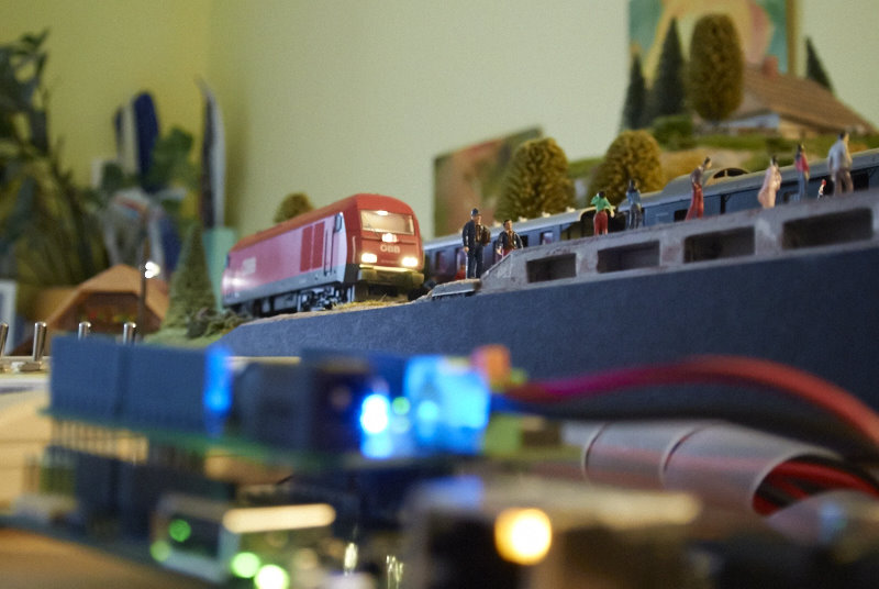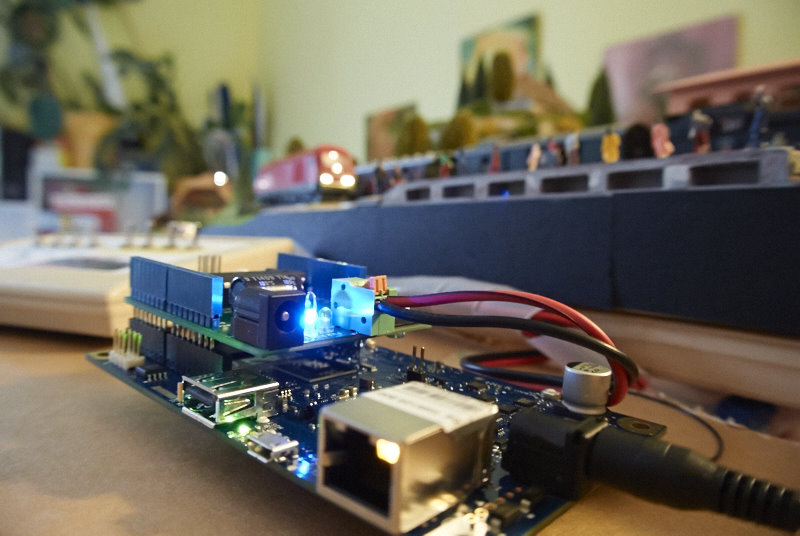 Intel Galileo gen 2, DCC/MM2 shield in wi-fi, priključeni na maketo v fazi testiranja.