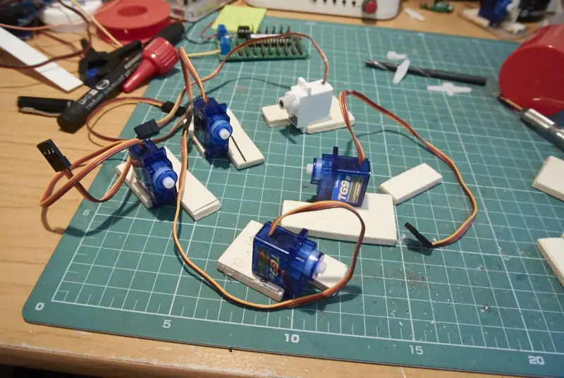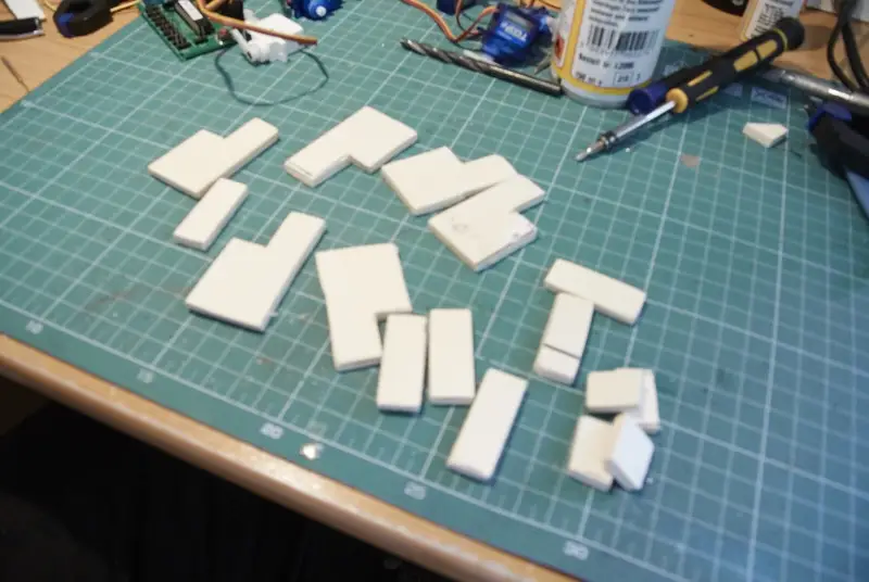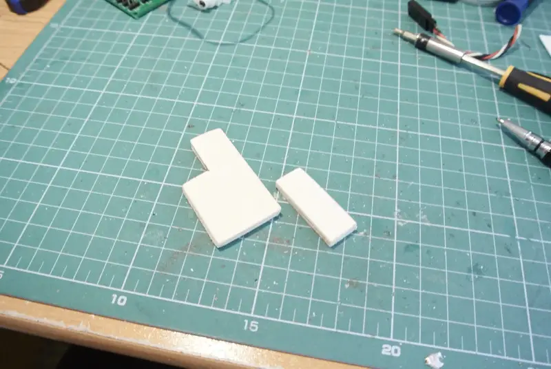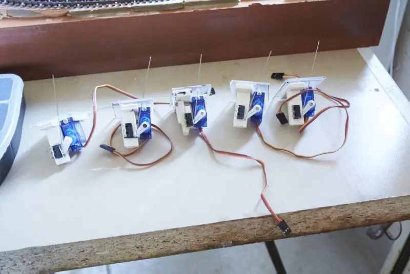 Ker bom za premik kretnic uporabil servo motorje, sem izdelal nosilce za njih. Nosilec je narejen iz 5 mm vezane plošče, na nosilcu je poleg servo motorja tudi stikalo za polarizacijo srca kretnice. Pod vezano ploščo sem zalepil malo večjo plastiko, skozi katero sem izvrtal 1,8 mm izvrtino. Skozi njo gre povezovalna žica na kretnico.