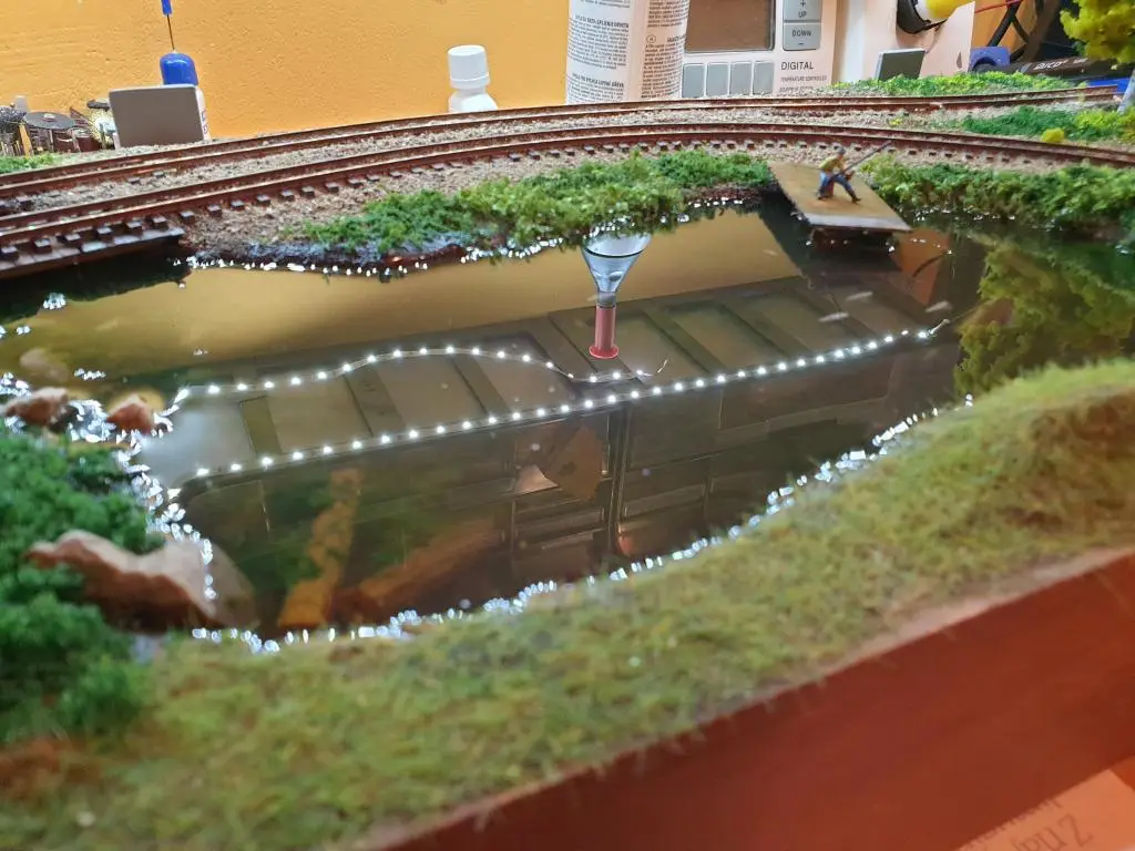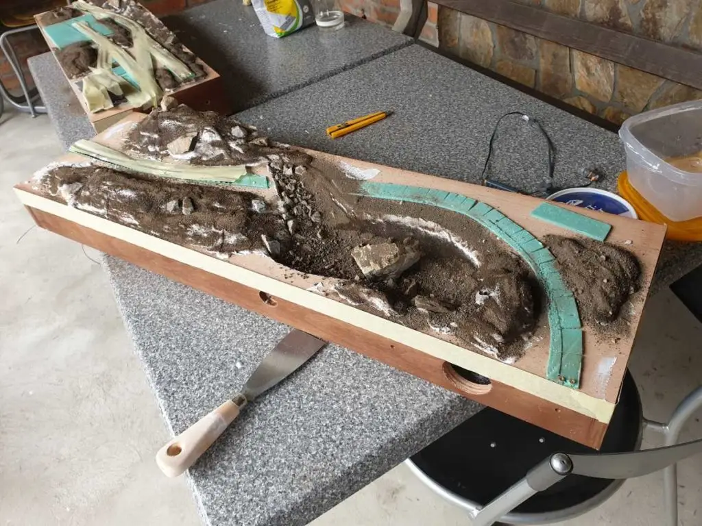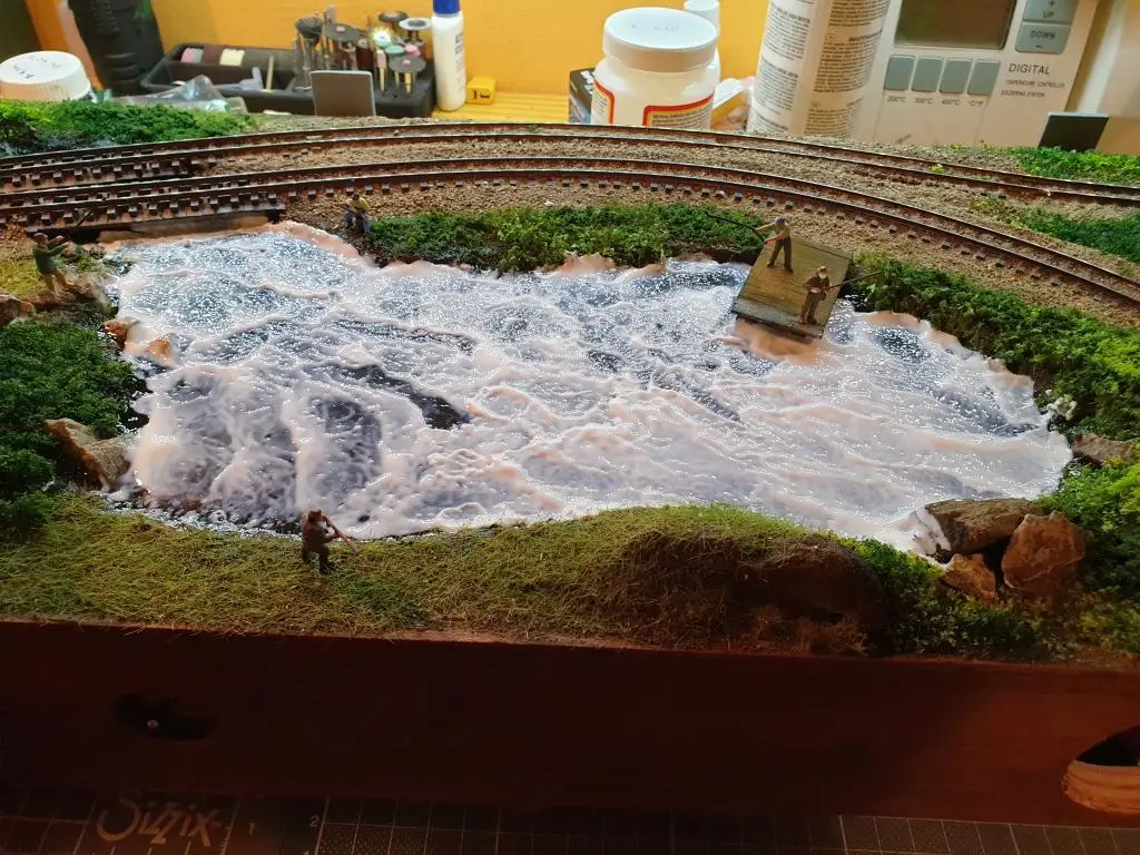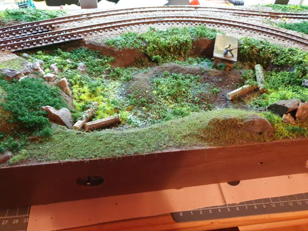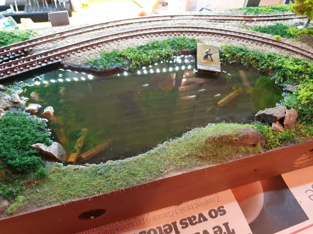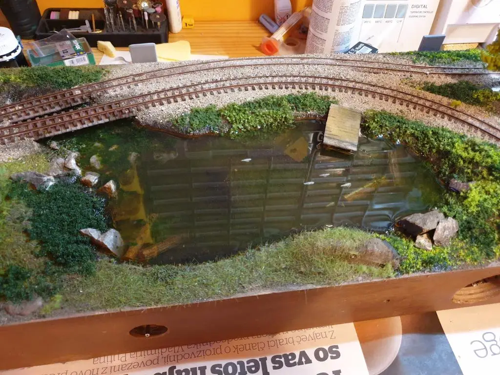Osnovo jezera sem naredil že takoj na začetku. Pred polaganjem tirov sem pod mostoma dodal, kamenje, pesek in zelenje.