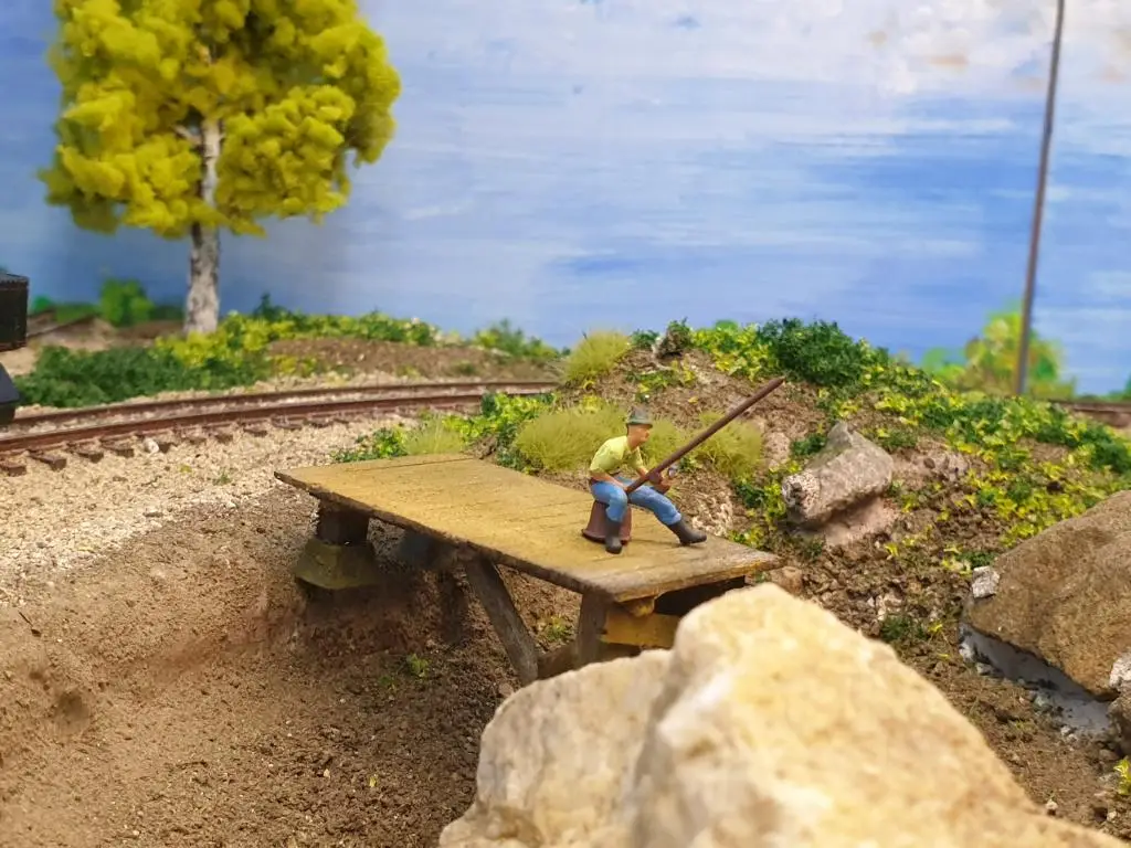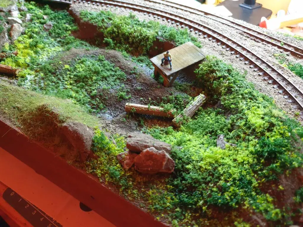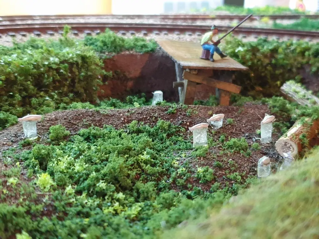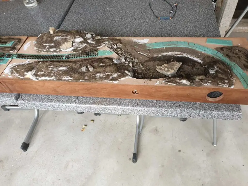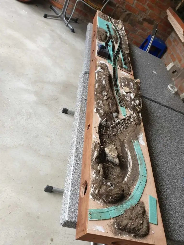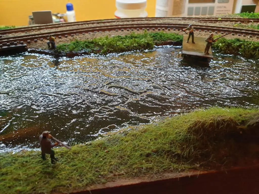 Osnovo jezera sem naredil že takoj na začetku. Pred polaganjem tirov sem pod mostoma dodal, kamenje, pesek in zelenje.