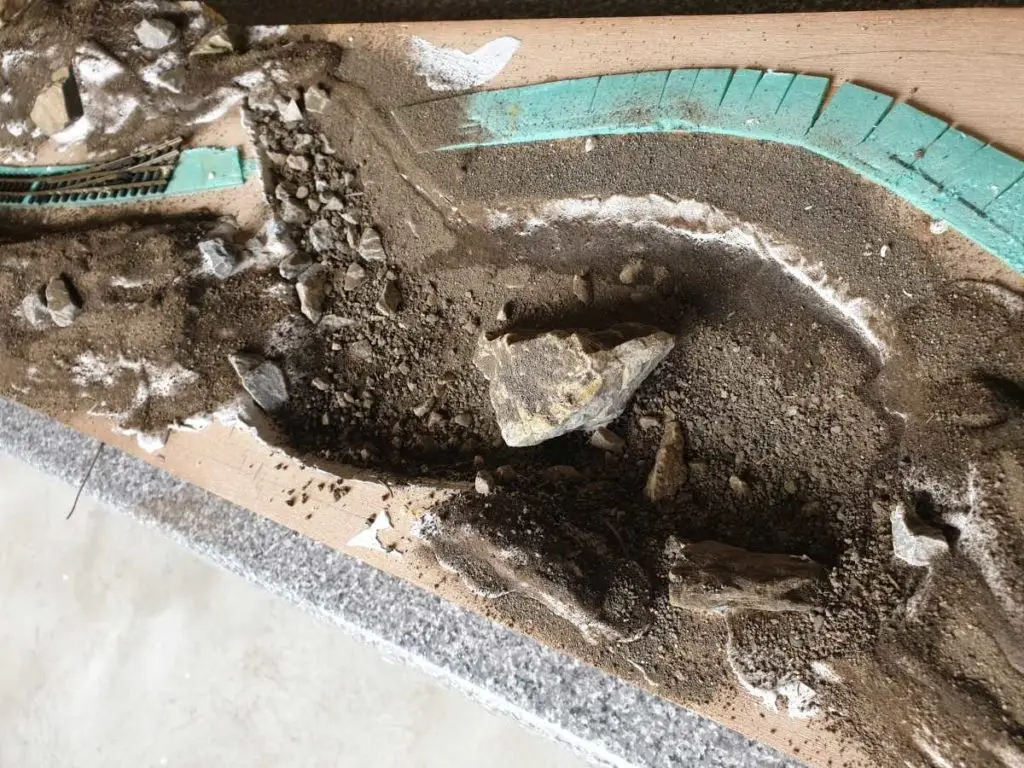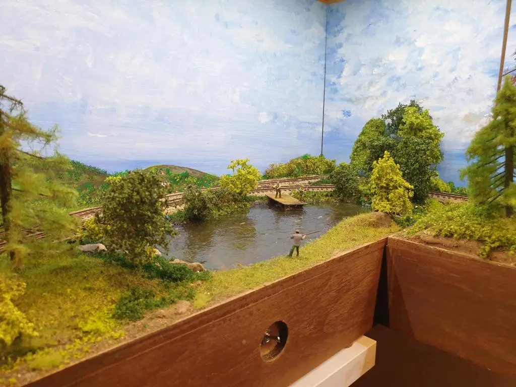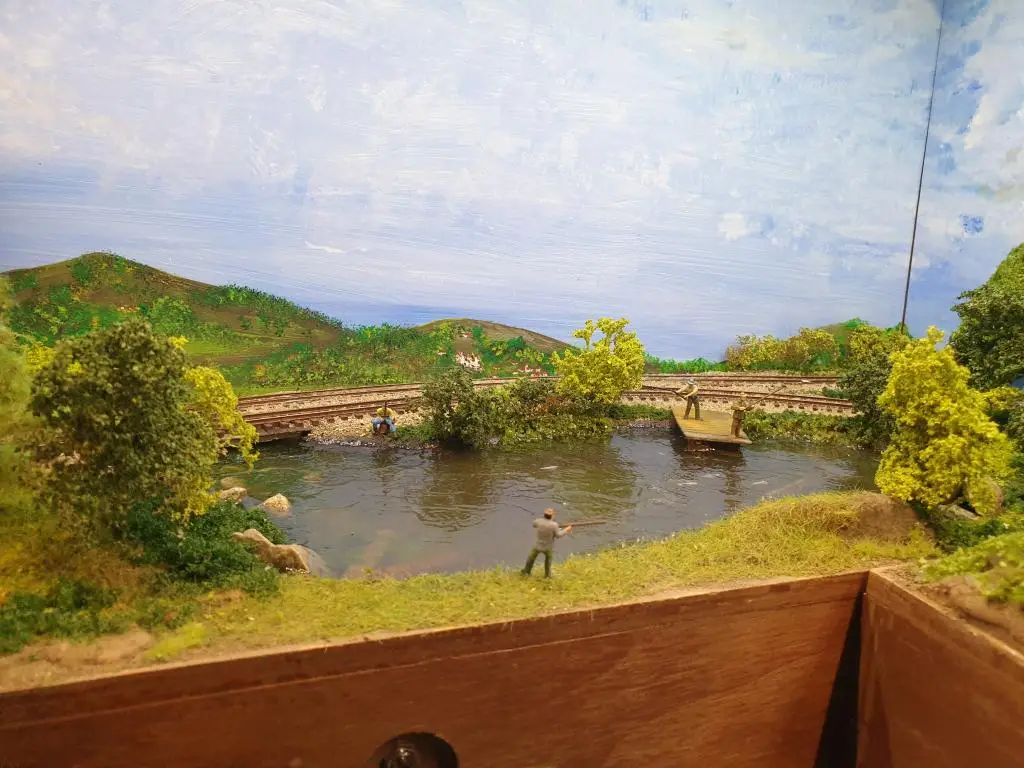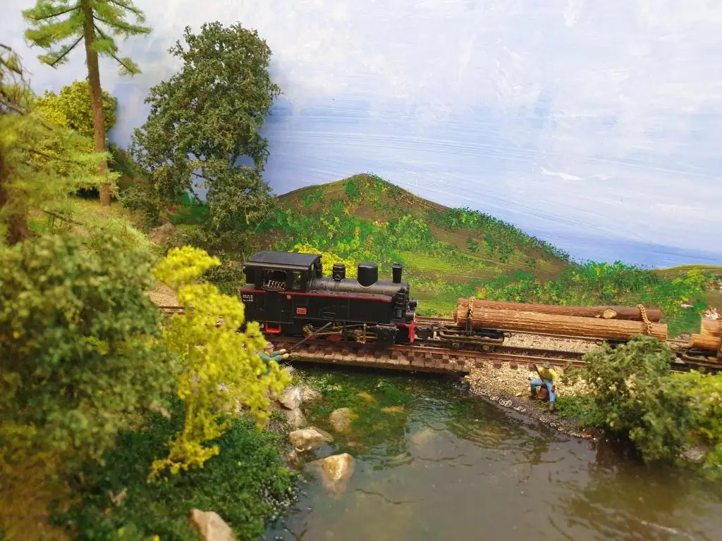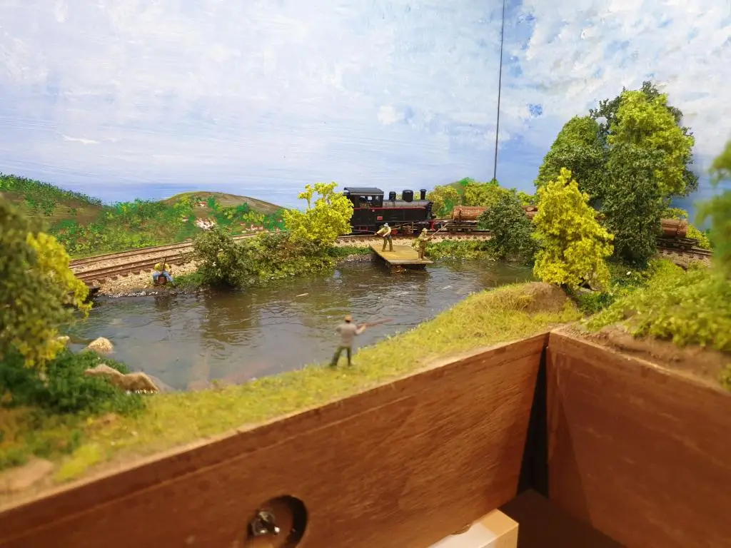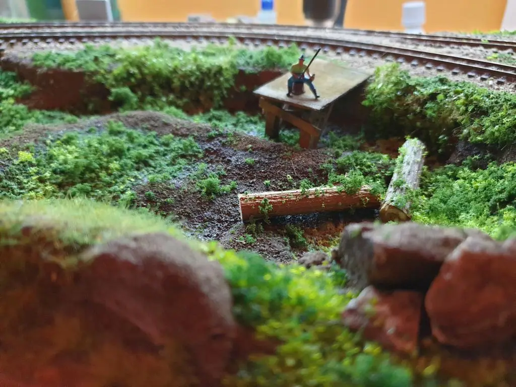 Osnovo jezera sem naredil že takoj na začetku. Pred polaganjem tirov sem pod mostoma dodal, kamenje, pesek in zelenje.