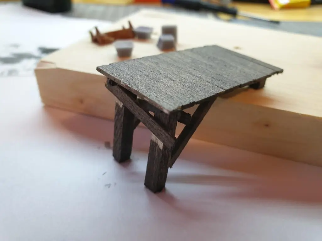 Najprej sem iz narezane 1mm balse in 3mm smrekovih letvic naredil manjši pomol.