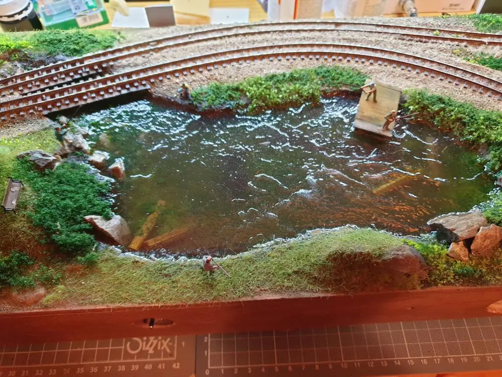 Sledila je izdelava dna ribnika, zelenje, nekaj hlodov, pritrditev rib. Ribe so resin 3D print.